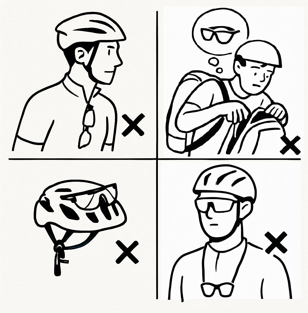 Fini le stress de perdre ou casser ses lunettes en roulant ou pendant une pause. On se concentre sur le plaisir du trajet sans se soucier de ses lunettes. Elles sont fixées devant prêtent à leur reprise.