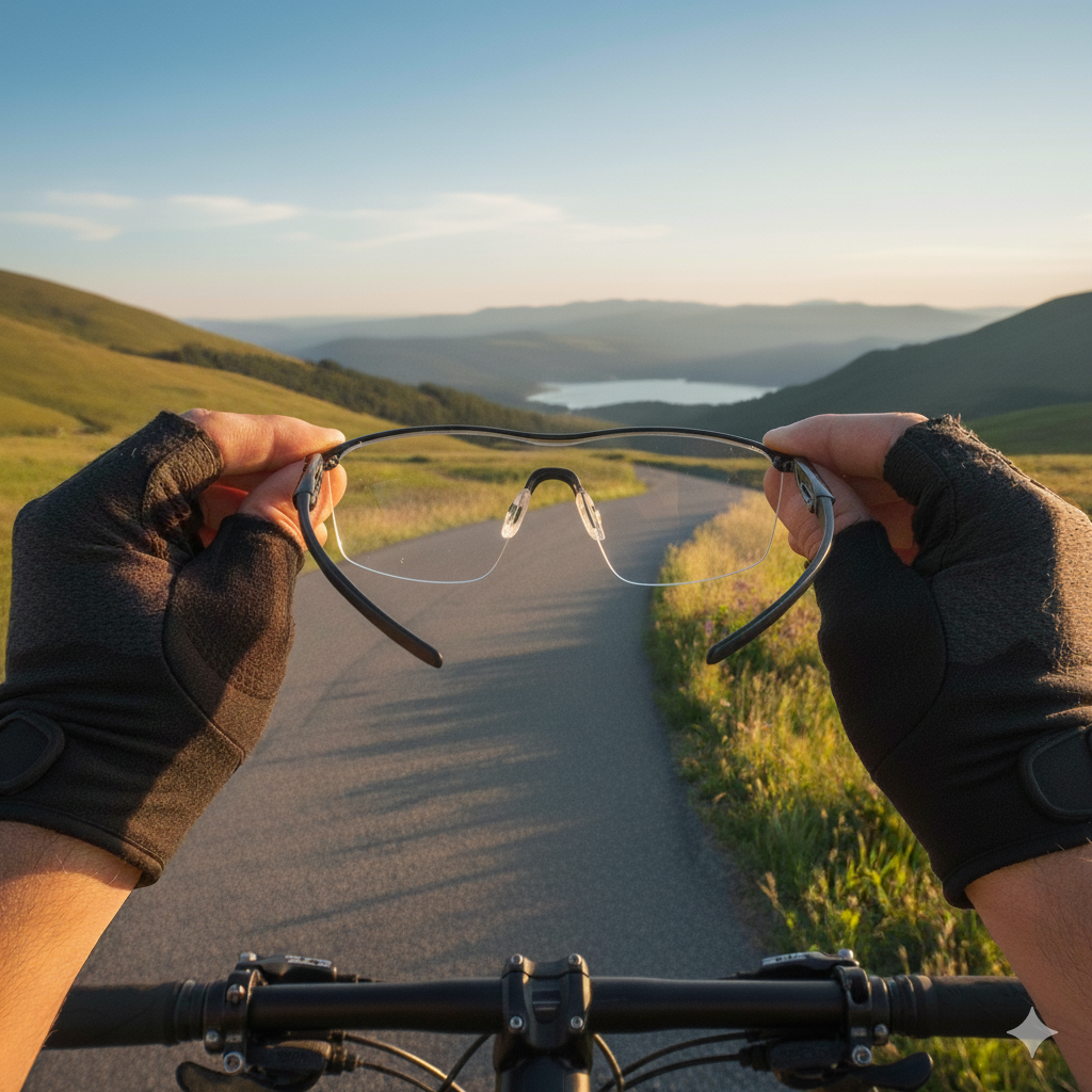 "Comme j'ai les yeux clairs, il me faut absolument des lunettes solaires, et de presbytie, et alterner les paires de lunettes. Avant j'utilisais ma sacoche guidon, alors que maintenant ce n'est pas nécessaire"